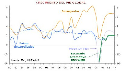 En cuanto al futuro que nos espera ya aparecen algunos estudios y proyecciones y os pego dos gráficos del Fondo Monetario Internacional donde podemos observar por un lado las estimaciones de crecimiento para los Paises Desarrollados para los próximos cinco años donde preveen un crecimiento entorno al 2 % y en cuanto al paro nos hacemos eco de este gráfico de Bloomberg donde vemos como en el caso de nuestro pais todavía no hemos tocado techo lo haremos a principios del 2.010 y la recuperación es tan lenta que se prevee que dentro de tres años nos encontremos con un desempleo similar al actual.
