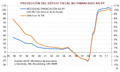 Lo que no había imaginado ni en el peor de mis sueños era que España iba a generar durante el año acutal un déficit fiscal de 130.000 Millones de Euros y las previsíones de Hacienda para los próximos dos años -y ya sabemos como le han salido al Gobierno las que hicieron para este año- es de segir aproximadamente en un 10 % de Deficit lo cual añade otros 260.000 Millones de Euros de deuda. Desde aquí teniendo en cuenta el Presupusto que han aprobado para el 2.010 y las hipotesis que han tenido en cuenta no nos asustemos que la realidad pueda ser peor en al menos un 20 %.