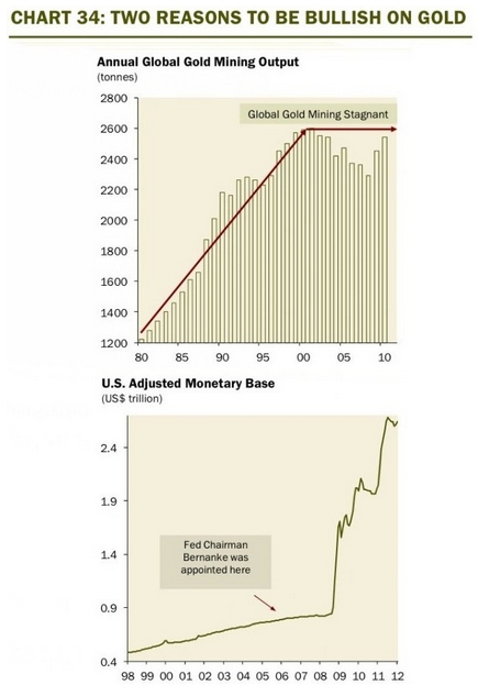 9) Otro de los activos estrellas durante la crisis de los que no me puedo olvidar como activo financiero para el 2.013 es el Oro, el cual a pesar de la caída experimentada durante el ultimo trimestre del año del orden del 8 %, pienso que debe seguir teniendo protagonismo en las carteras de inversión de cualquier inversor prudente ya que es una magnifica protección tal y como ha demostrado contra la crisis financiera; crisis esta que todavía no ha acabado ya que nos vemos todavía en medio de un proceso de desapalancamiento global. Por otro lado, tener en cuenta que la masa monetaria sigue aumentando a nivel mundial gracias a las políticas de expansión monetaria llevadas a cabo por la mayoría de bancos centrales y por otro lado no hay que olvidar que la producción mundial de oro se encuentra en niveles algo inferiores al existente hace 10 años.